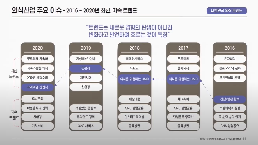 해당 대회에서는 지난 2016년부터 2020년까지 외식트렌드를 훑어보면서 앞으로 2021년에 지속될 트렌드와 또 새로 부상할 외식산업의 변환느 어떤 것인지 상세하게 발표되었습니다.